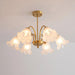 Dieser achtflammige Kronleuchter mit klaren, gesprenkelten Schirmen besticht durch sein attraktives, filigranes Design. Die Schirme sind aus mundgeblasenem Kunstglas gefertigt. An elegant geschwungenen Armen hängen lilienförmige Schirme. Der Rahmen aus goldfarbenem Eisen ist handgefertigt.